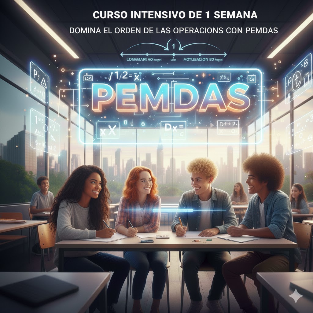 Este curso intensivo de una semana está diseñado para que estudiantes y adultos dominen el método PEMDAS (Paréntesis, Exponentes, Multiplicación y División, Suma y Resta), la regla fundamental para resolver correctamente cualquier expresión matemática con múltiples operaciones.